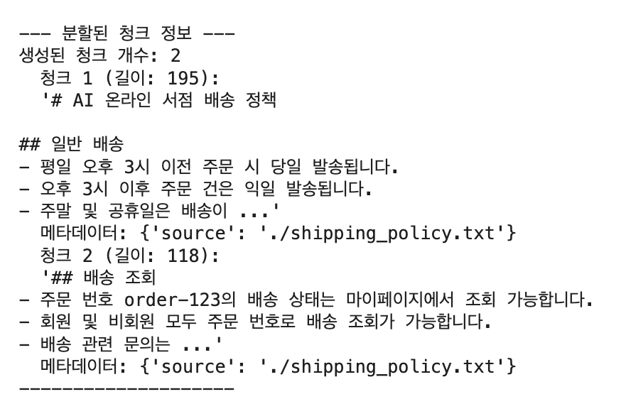 from langchain_text_splitters import RecursiveCharacterTextSplitter # 2. RecursiveCharacterTextSplitter를 사용하여 문서 분할 # 적절한 chunk_size와 chunk_overlap을 설정합니다. # 여기서는 예시로 설정하며, 실제 적용 시에는 데이터 특성에 맞게 조정해야 합니다. text_splitter = RecursiveCharacterTextSplitter( chunk_size=200, # 청크 최대 크기 (문자 단위) chunk_overlap=20, # 청크 간 겹치는 부분 (문자 단위) length_function=len, # 길이를 문자로 계산 is_separator_regex=False, ) chunks = text_splitter.split_documents(documents) print("\n--- 분할된 청크 정보 ---") print(f"생성된 청크 개수: {len(chunks)}") for i, chunk in enumerate(chunks): print(f" 청크 {i+1} (길이: {len(chunk.page_content)}):") print(f" '{chunk.page_content[:100]}...'") # 각 청크의 앞부분만 출력 print(f" 메타데이터: {chunk.metadata}") print("-" * 20)chunk_size: 청크 최대 크기 (문자 단위)chunk_overlap: 청크 간 겹치는 부분 (문자 단위)