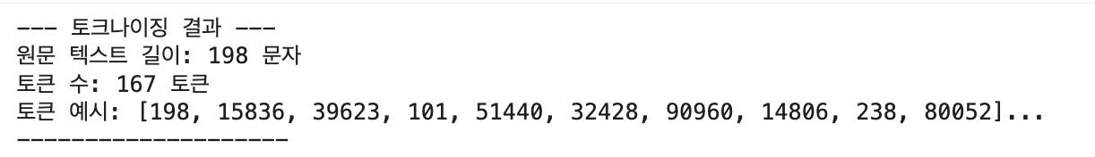 tiktoken라이브러리를 사용하여 토크나이징할 수 있다.# 모델에 따라 인코딩 방식이 다를 수 있음. 여기서는 'cl100k_base'를 사용. import tiktoken # 예시 텍스트 text = """ AI 온라인 서점입니다. 고객님의 소중한 문의에 감사드립니다. 배송 정책에 대해 안내해 드리겠습니다. 일반 도서의 경우 오후 3시 이전 주문 시 당일 발송됩니다. 주말 및 공휴일은 배송이 어렵습니다. 제주 및 도서 산간 지역은 추가 배송비가 발생할 수 있습니다. 주문 번호 order-123의 배송 상태를 조회하시려면 마이페이지에서 확인 부탁드립니다. """ encoding = tiktoken.get_encoding("cl100k_base") tokens = encoding.encode(text)