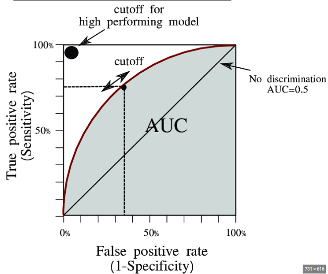 - x축 False Positive Rate(=1-특이도) : 음성인 케이스에 대해 양성로 잘못 예측한 비율. (정상환자를 암이라고 진단 함)